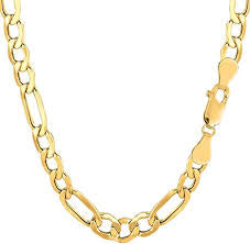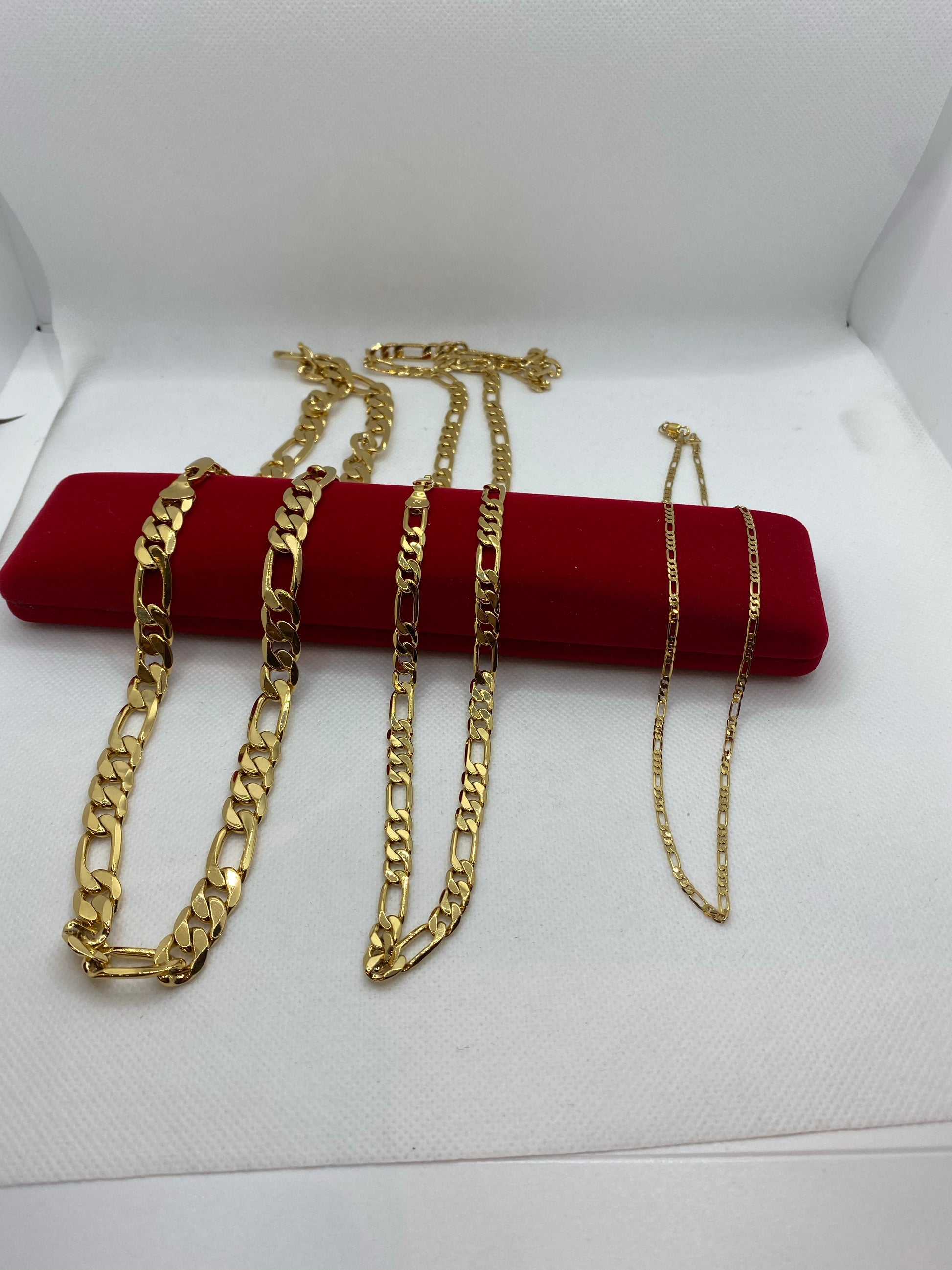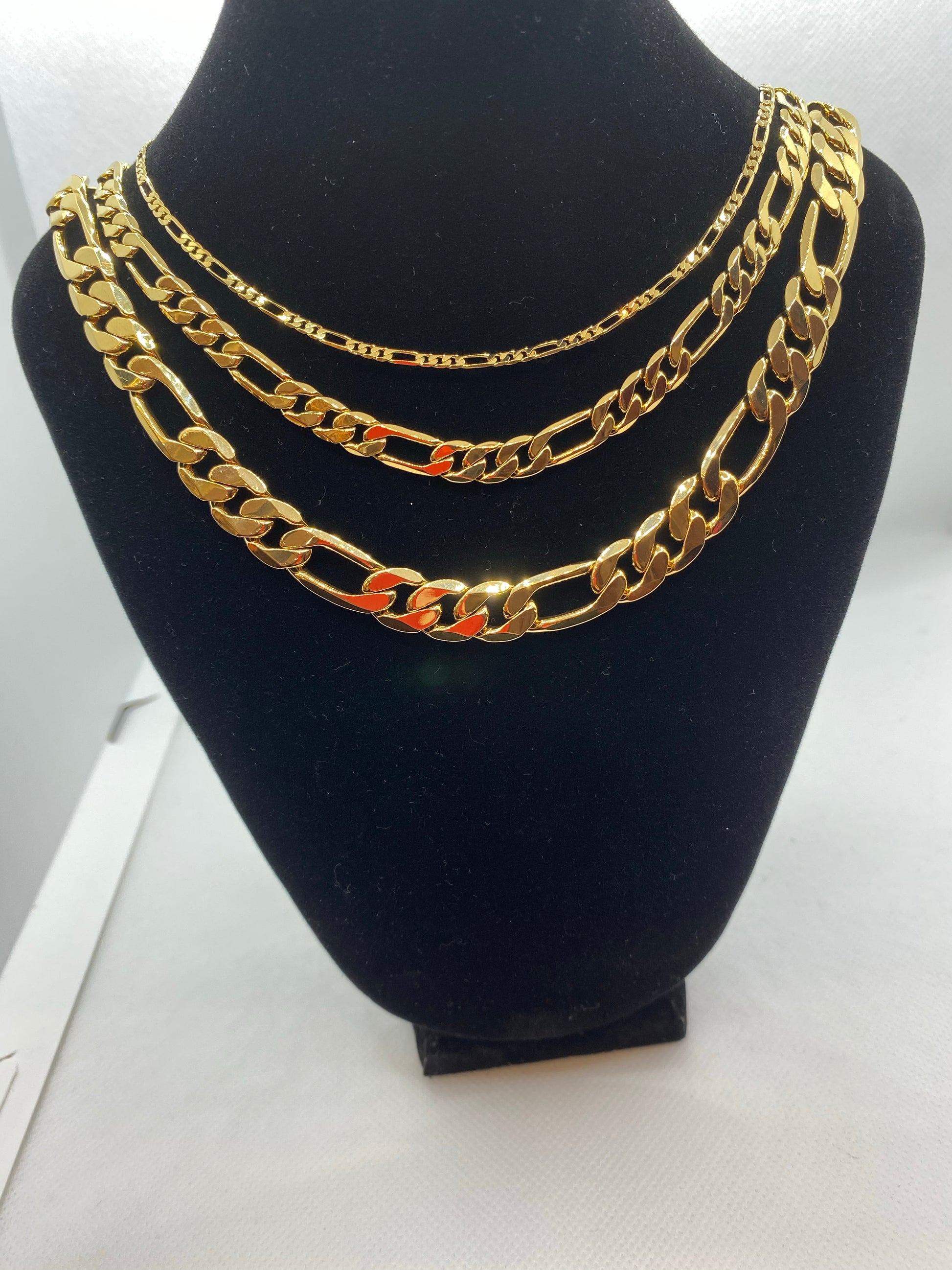 Chaînes Figaro plaquées or 18 carats. Ce bijou classique et élégant arbore une finition bronze doré chaleureuse qui respire la chaleur et la robustesse. Son design à maillons Figaro est un savoir-faire artisanal qui garantit sa longévité. Disponible en différentes tailles.