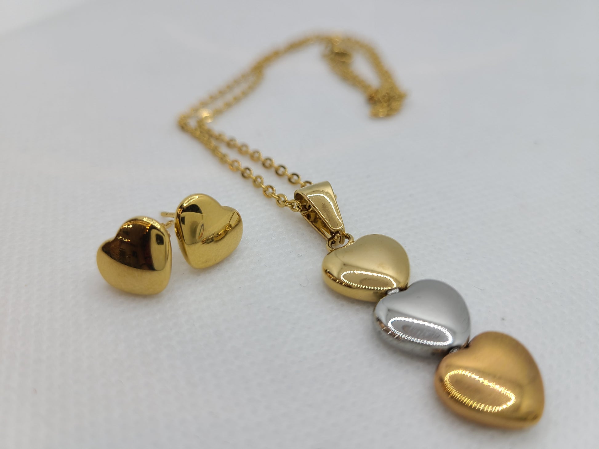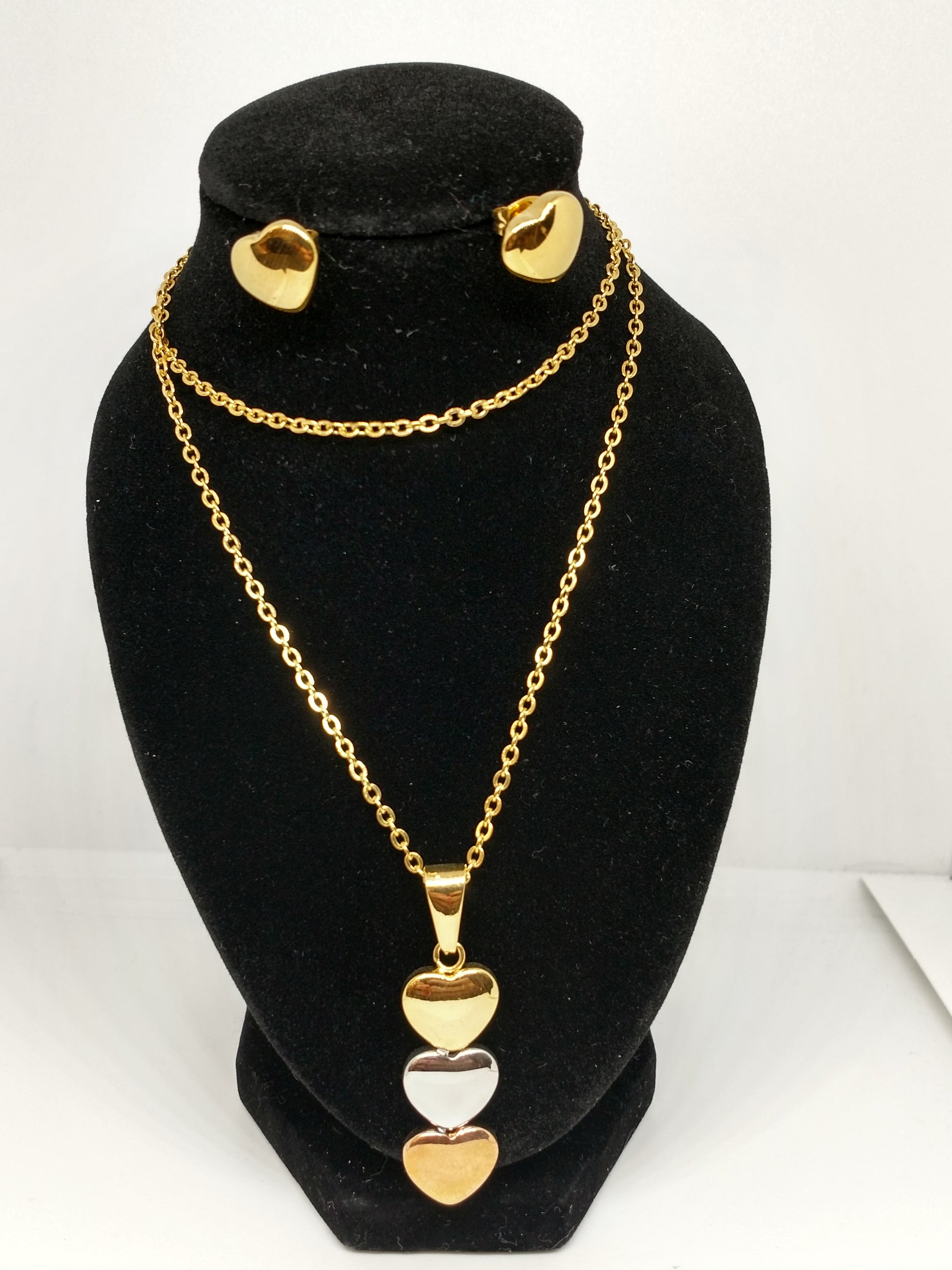 Collier et boucles d'oreilles double cœur bicolores plaqués or 18 carats. Couleur et brillance garanties pour un usage quotidien normal pendant au moins 2 ans.