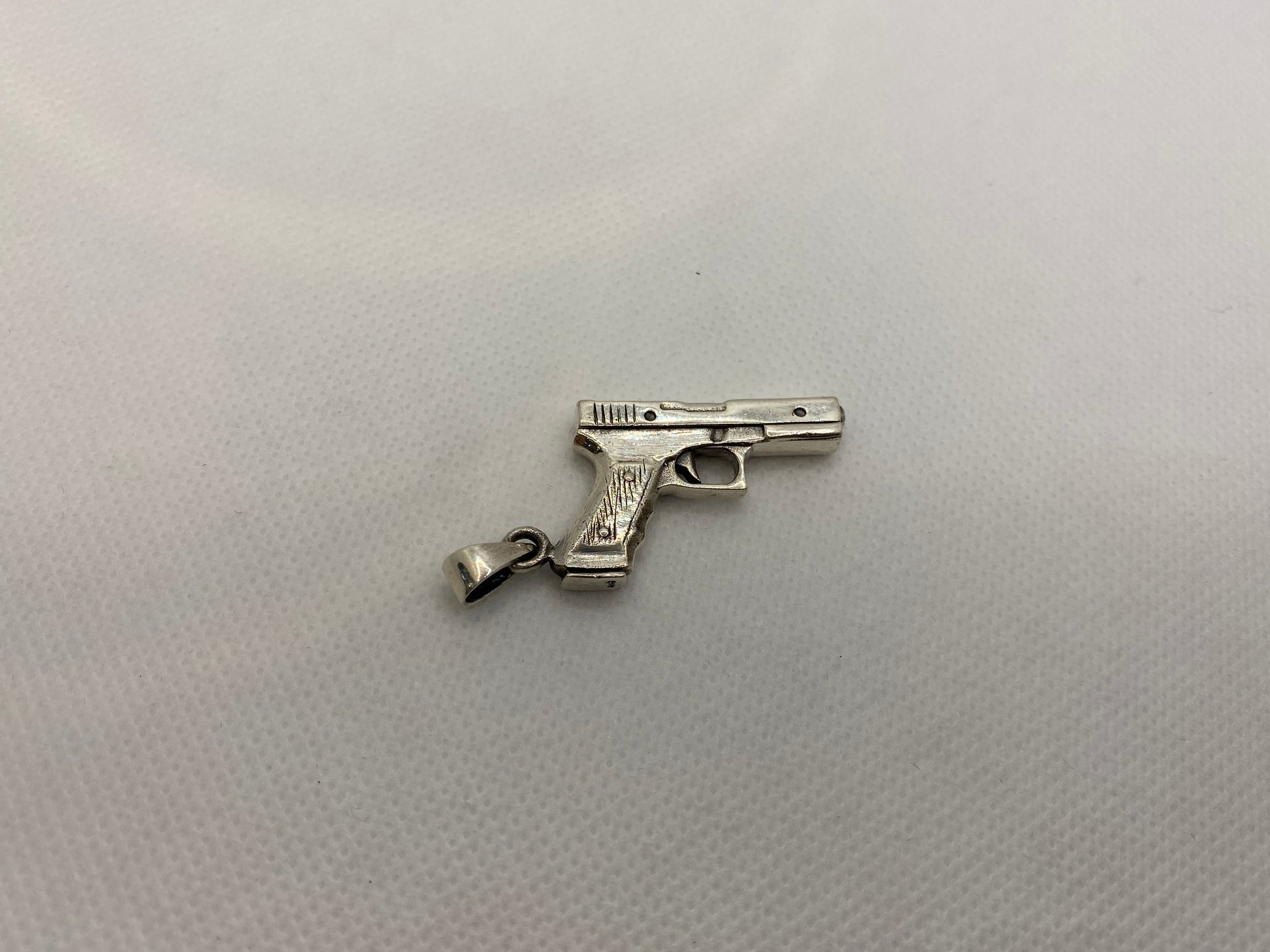 Ce collier pendentif en forme de pistolet en argent présente un design 3D artistique et complexe qui captera sûrement l'attention de tous.