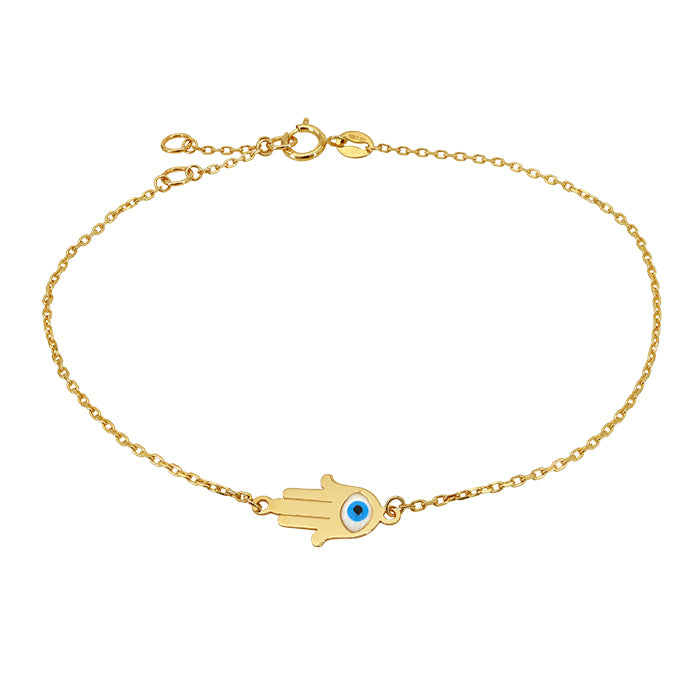 10KT ਸੋਨਾ, 1mm ਐਂਕਰ ਲਿੰਕ ਦੇ ਨਾਲ 7x10mm ਹਮਸਾ ਹੈਂਡ ਐਂਡ ਈਵਿਲ ਆਈ ਬਰੇਸਲੇਟ, 6.5″ + 0.5″ + 0.5″ ਐਕਸਟੈਂਸ਼ਨ