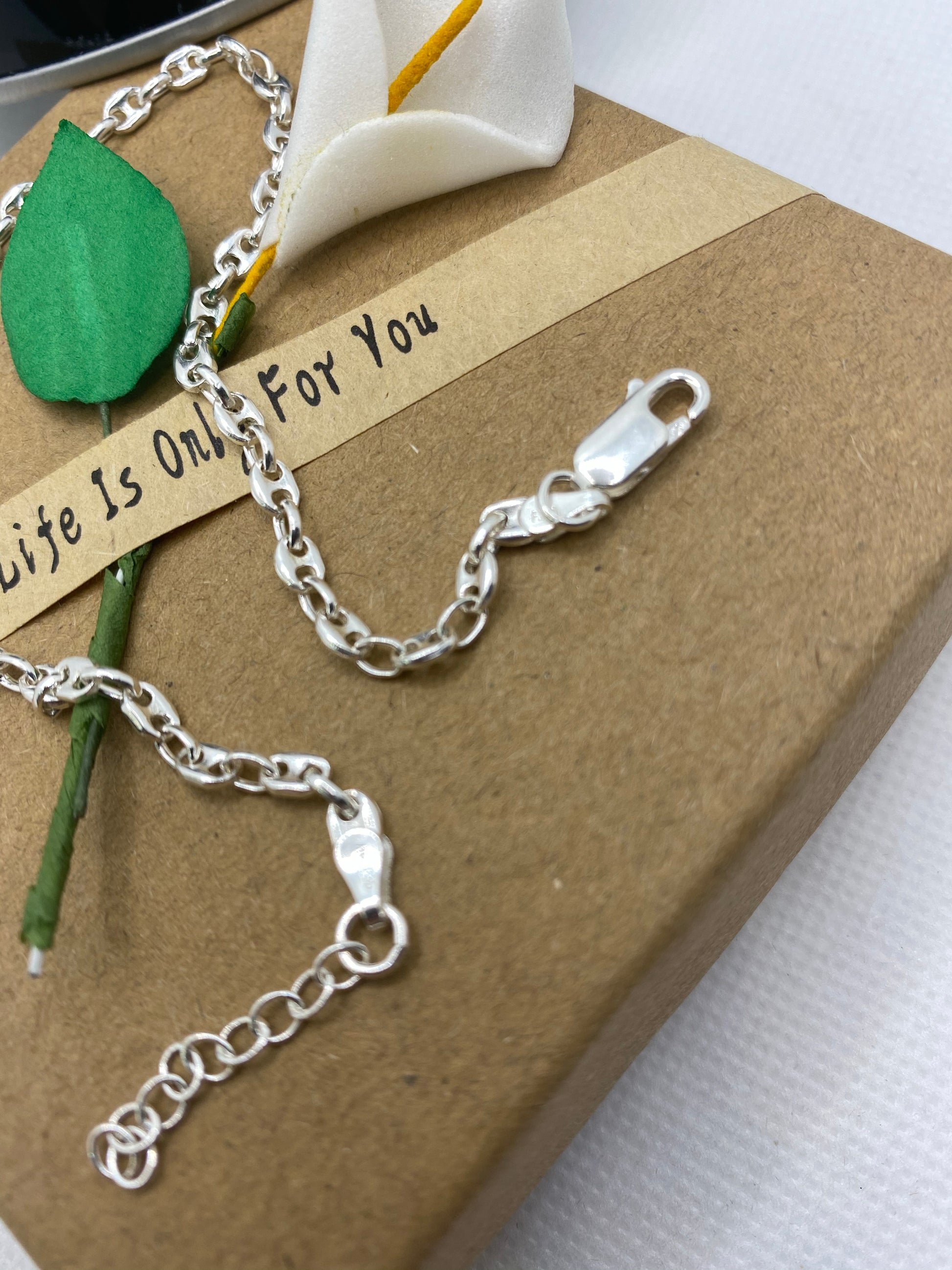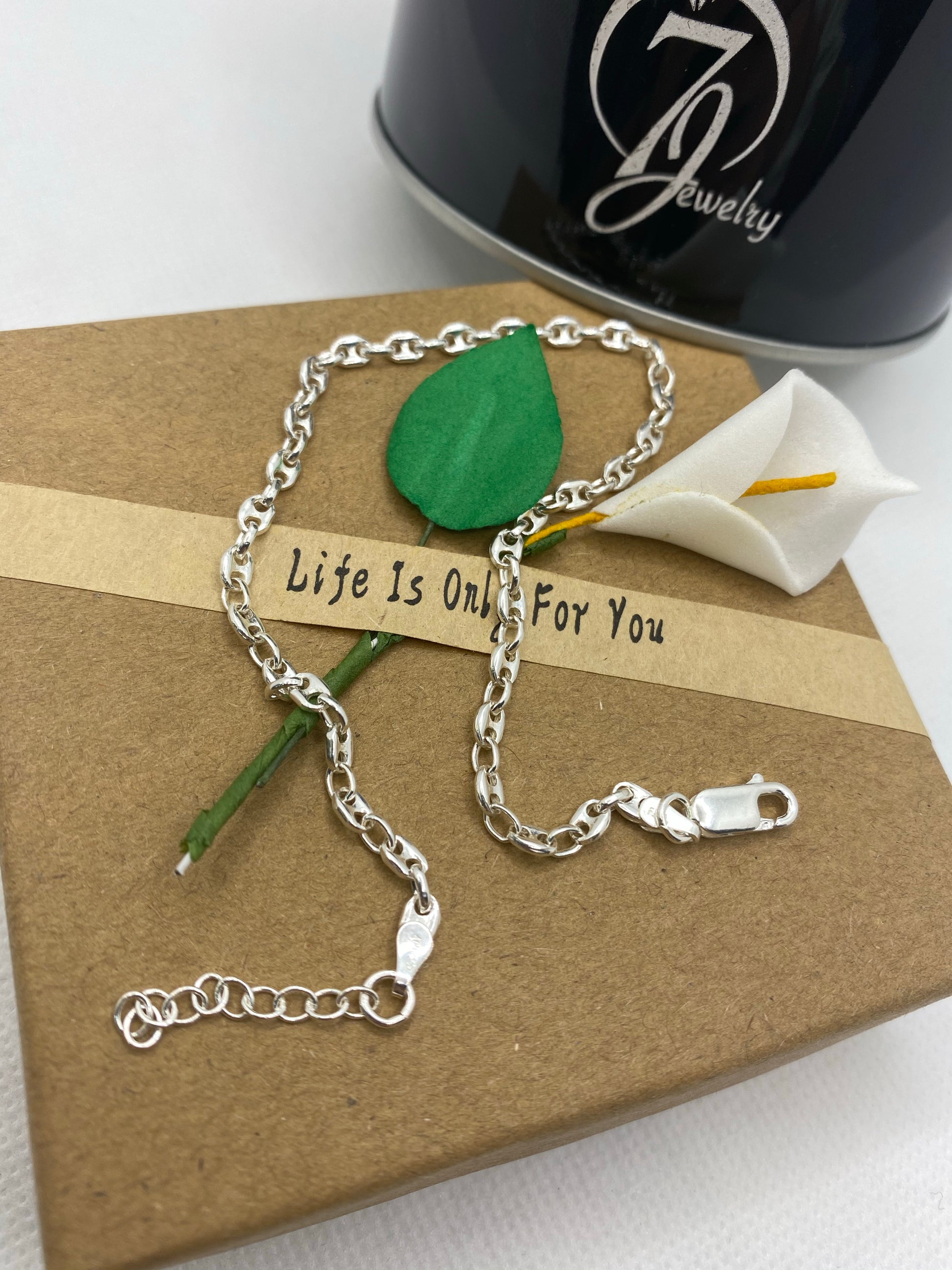 ਸਮੱਗਰੀ 925 ਸਟਰਲਿੰਗ ਸਿਲਵਰ ਹੈ ਜਿਸਦਾ ਰੰਗ ਕਦੇ ਨਹੀਂ ਬਦਲਦਾ। ਇਸਦੀ 1.5mm ਮੋਟਾਈ, ਲੰਬਾਈ ਵੱਧ ਤੋਂ ਵੱਧ 10.5 ਇੰਚ ਤੱਕ ਵਿਵਸਥਿਤ ਕੀਤੀ ਜਾ ਸਕਦੀ ਹੈ।