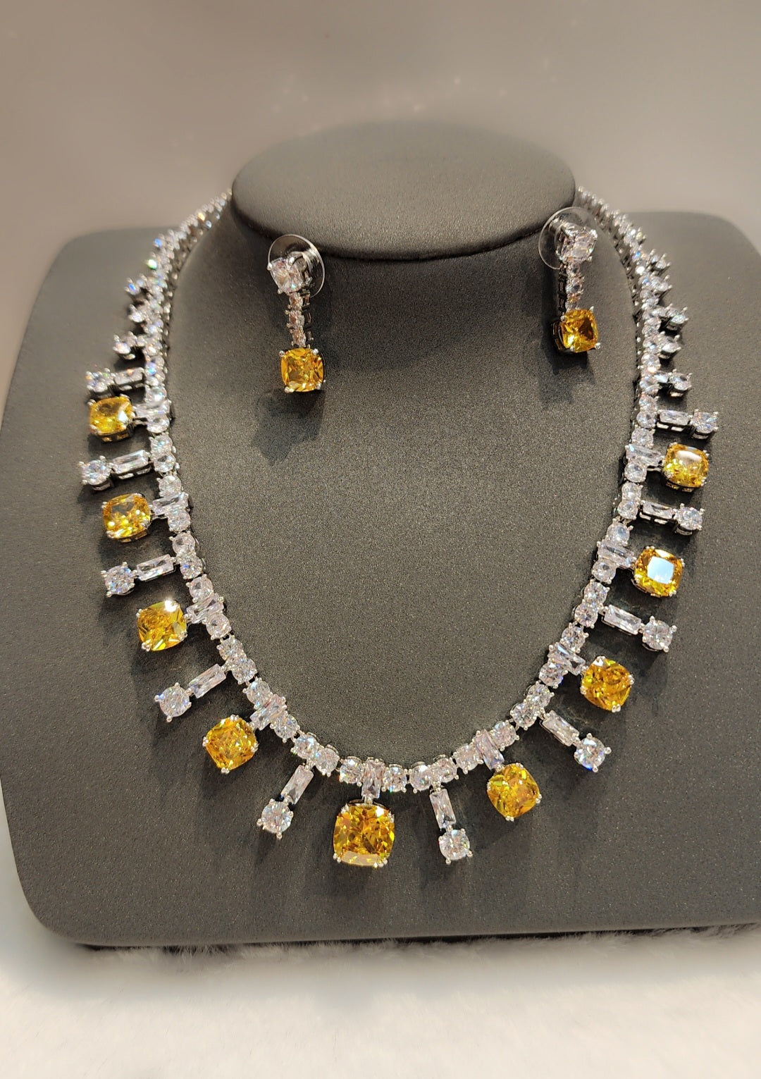ਇਹ ਸੈੱਟ ਆਪਣੀ ਚਿੱਟੇ ਸੋਨੇ ਦੀ ਪਲੇਟਿੰਗ ਅਤੇ ਚਮਕਦਾਰ ਕਿਊਬਿਕ ਜ਼ਿਰਕੋਨੀਆ ਪੱਥਰ ਨਾਲ ਇੱਕ ਸ਼ਾਨਦਾਰ ਦਿੱਖ ਪ੍ਰਦਾਨ ਕਰਦਾ ਹੈ। ਕਿਸੇ ਵੀ ਰਸਮੀ ਮੌਕੇ ਲਈ ਸੰਪੂਰਨ, ਇਹ ਸੈੱਟ ਕਿਸੇ ਵੀ ਪਹਿਰਾਵੇ ਵਿੱਚ ਸ਼ਾਨ ਅਤੇ ਸੂਝ-ਬੂਝ ਜੋੜਦਾ ਹੈ। ਉੱਚ ਗੁਣਵੱਤਾ ਵਾਲੀ ਸਮੱਗਰੀ ਲੰਬੇ ਸਮੇਂ ਤੱਕ ਚੱਲਣ ਵਾਲੀ ਪਹਿਨਣ ਅਤੇ ਸਦੀਵੀ ਸੁੰਦਰਤਾ ਨੂੰ ਯਕੀਨੀ ਬਣਾਉਂਦੀ ਹੈ।