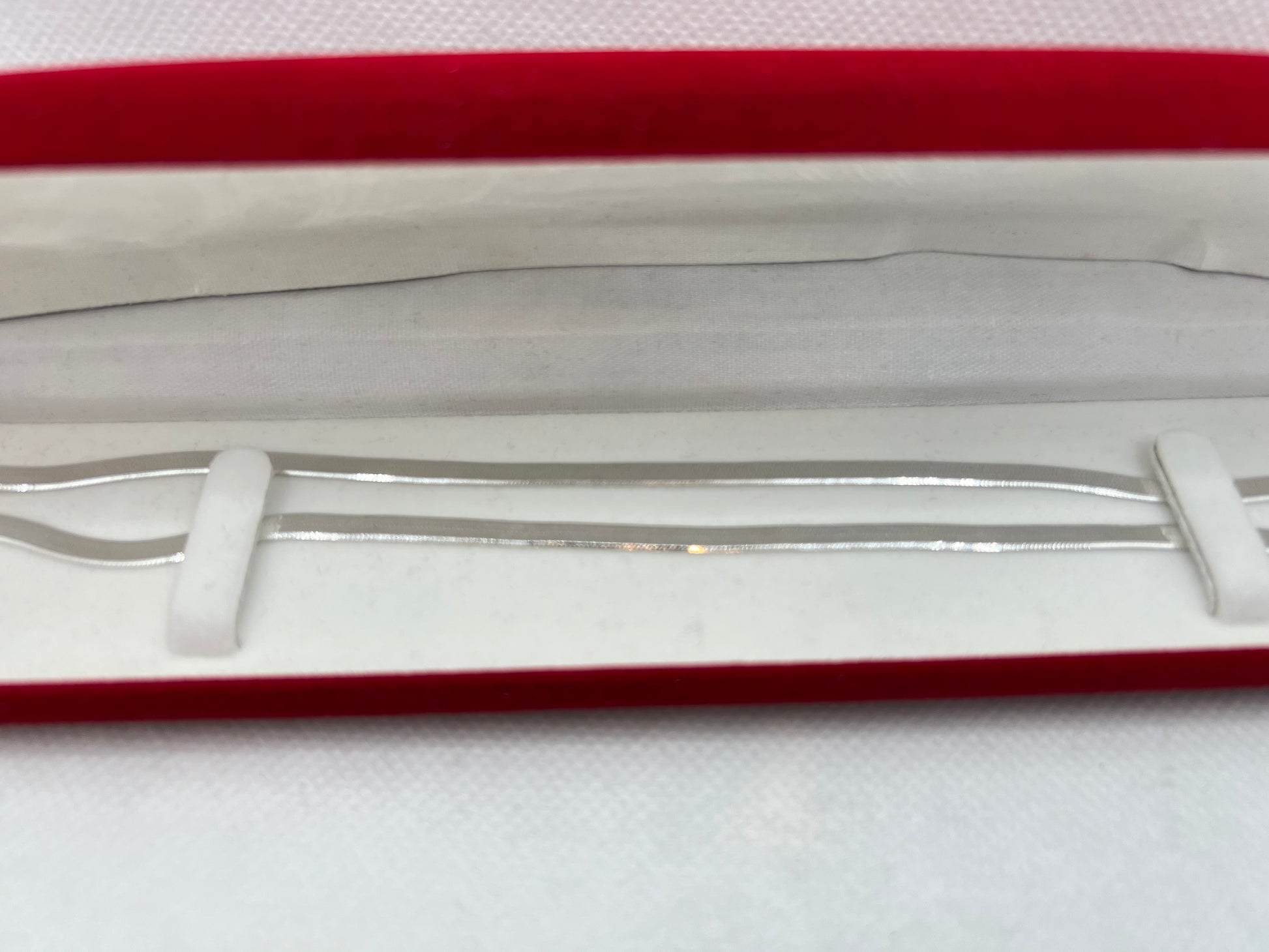 Material is 925 Sterling silver for which color never changes. Its 1.5 mm thick, length is adjustable to maximum of 10.5 inches.