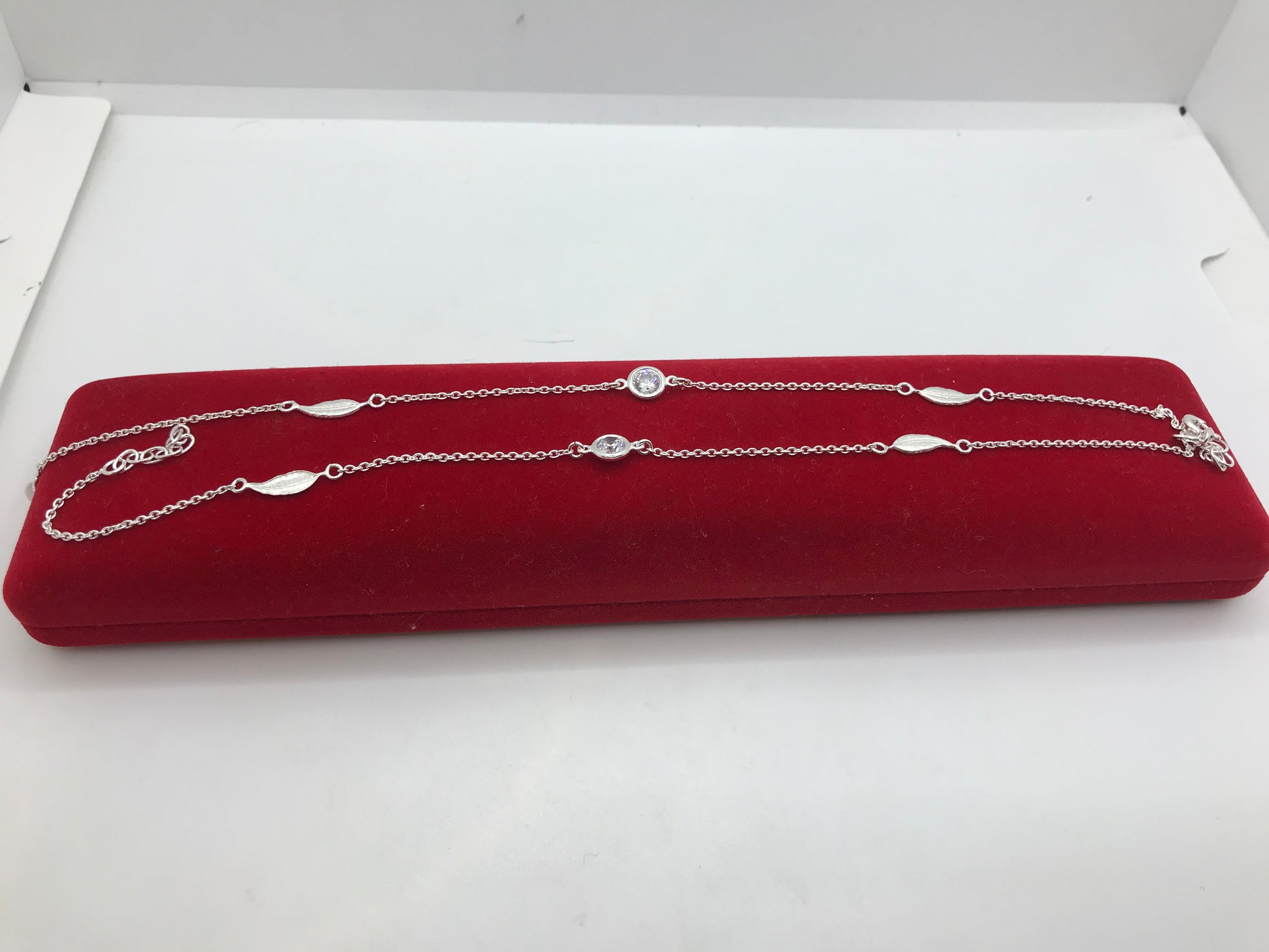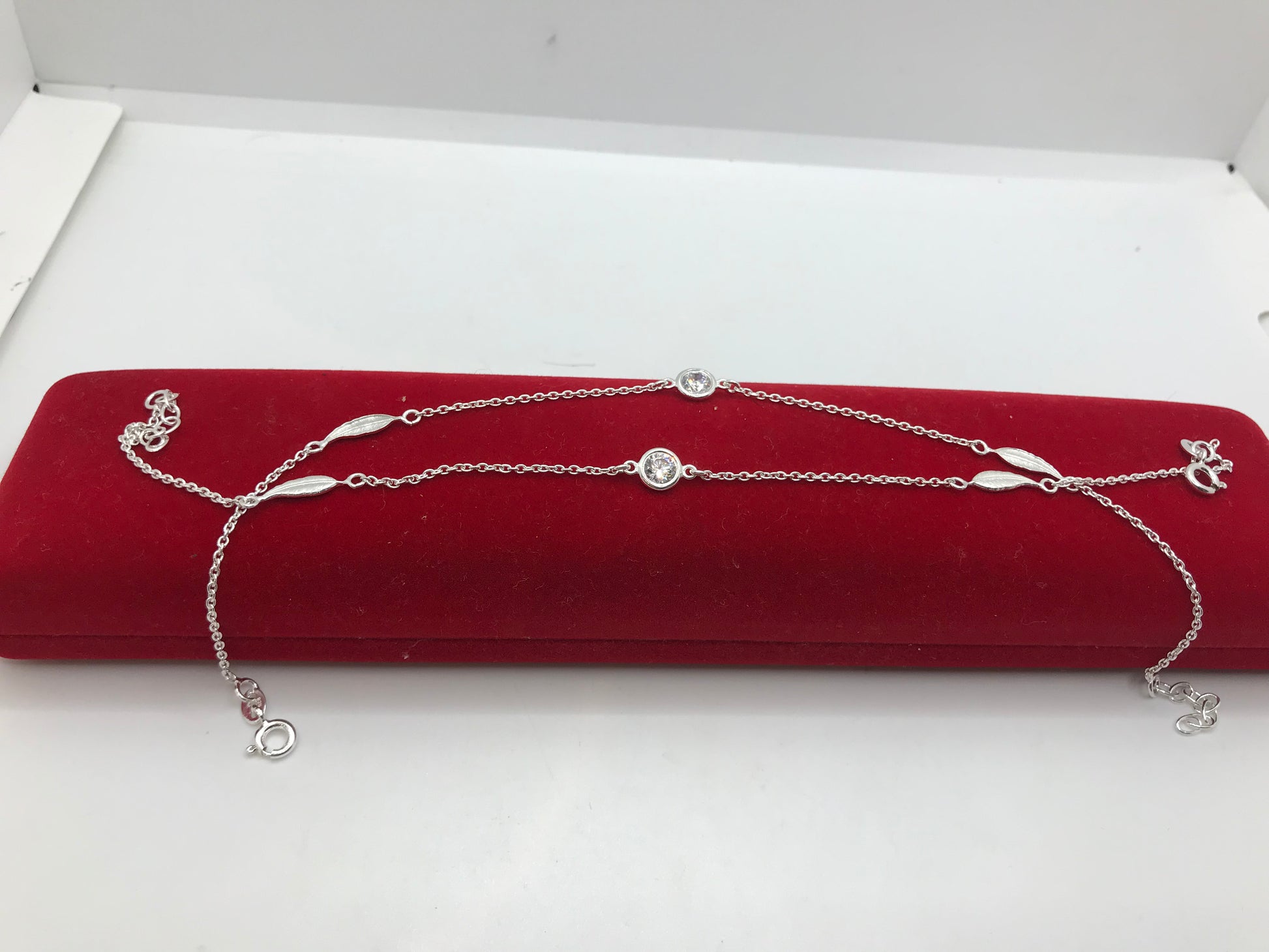 Sterling silver anklet, 13x4mm leaf and 7mm CZ, 9″+1″ extension.
