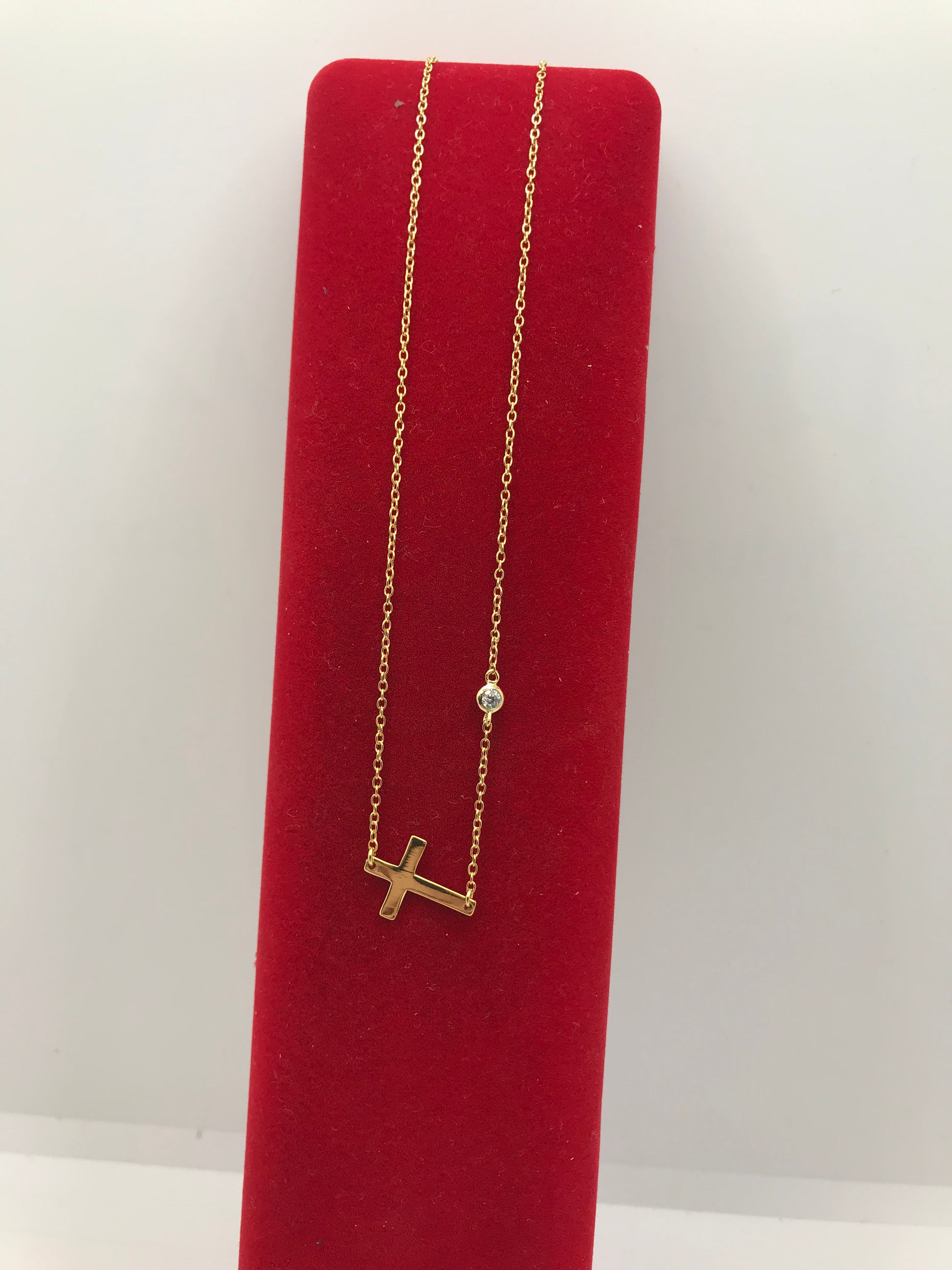 Sterling silver with gold, 15x11mm cross necklace with 3mm cubic zirconia, 16″+ 2″ extension.